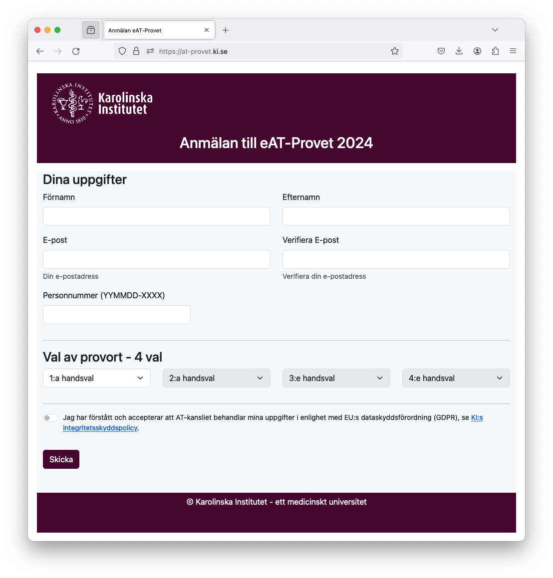 Du anger dina person- och kontaktuppgifter samt gör minst 3 val av skrivort. Klicka på skicka. En länk kommer under dagen att skickas till din angivna e-postadress som leder till steg 2. OBS! Spara ditt unika ID du får vid din anmälan.